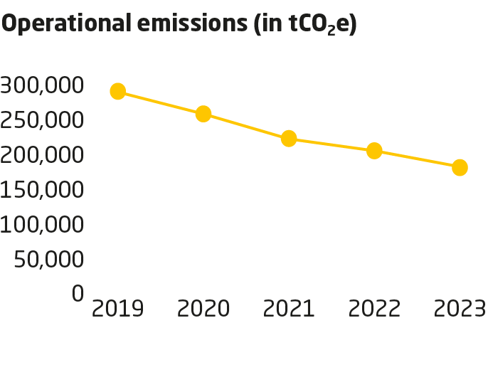 Since the adoption of our near-term absolute emissions reduction targets, we measure our environmental performance against these. Operational emissions comprise scope 1, scope 2 (market-based) and scope 3 (business travel and employee commuting).