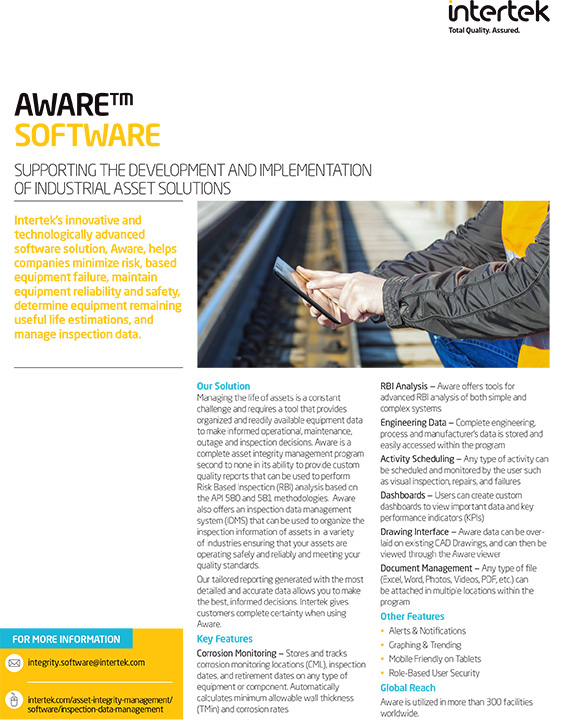 Intertek’s Aware™ Asset Performance Management (APM) software platform provides a web-based collaborative management solution for owners and operators in a variety of industries.